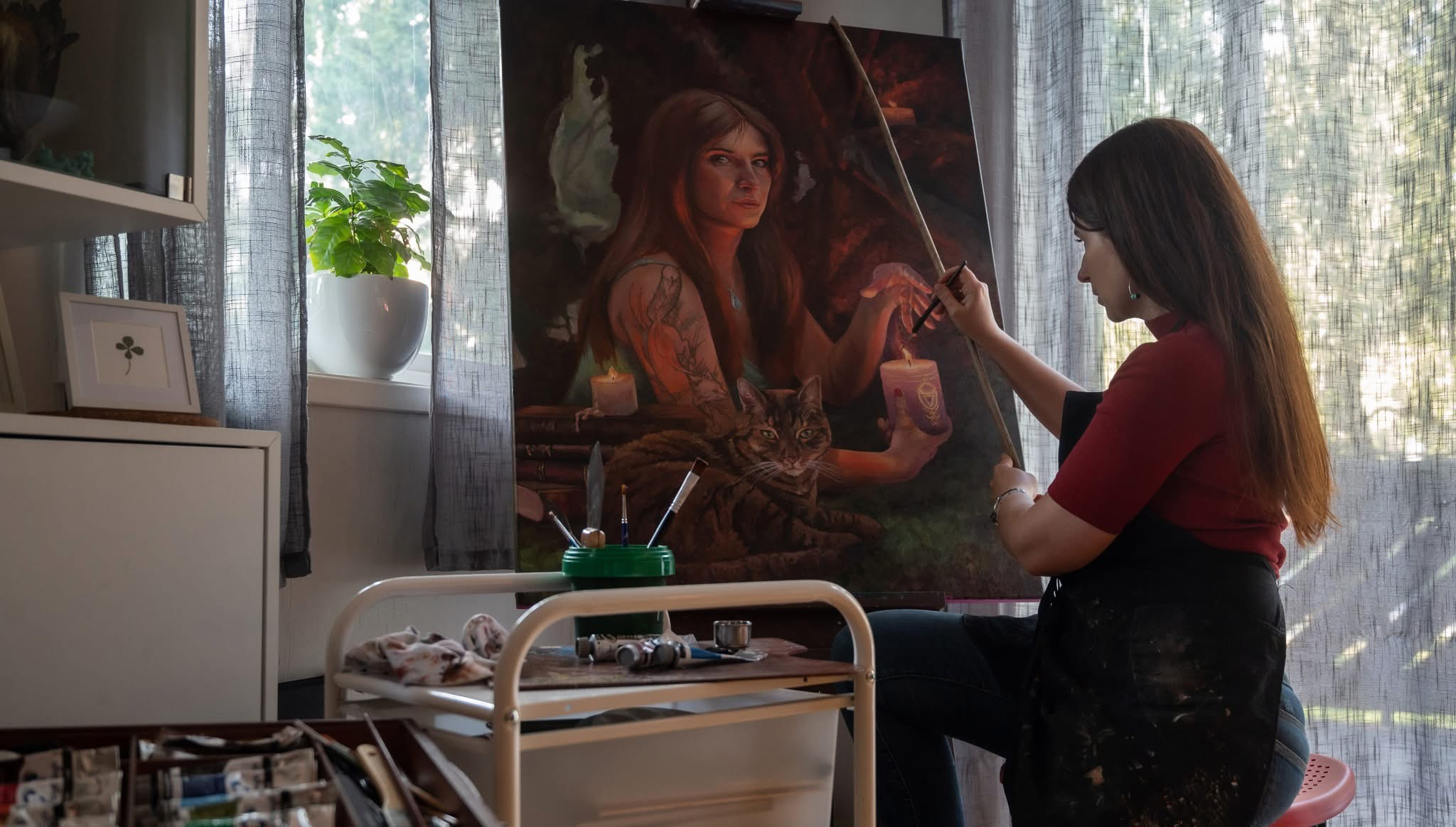 Jeg maler med glede både mennesker og dyr – hver og en har sin unike personlighet som kan tre frem på lerretet. I arbeidene mine bruker jeg også symbolikk, ekspressive former og fargepsykologi for å gi portrettene større dybde og emosjonell styrke.